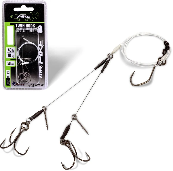 De Quantum Mr. Pike Ghost Traces Twin Hook-Release-Rig White 50cm onderlijnen zijn gemaakt van onopvallend Ghost-Wire carbonstaal voor het vissen in open water met dobbers. De Twin Hook-Release-Rig zo ontworpen dat bij het zetten van de haak de aasvis automatisch los komt van de takel, waardoor de haken beter in de bek van de snoek blijven zitten. In de praktijk blijkt dat dit ontwerp over langere tijd heeft bewezen dat hiermee tot 90% meer vis geland kan worden. Er worden ook uitsluitend originele AFW sleeves in het juiste formaat gebruikt, om voor een gelijkblijvende kwaliteit te zorgen. Alle onderlijnen zijn handgemaakt, met zorg samengesteld en onderworpen aan een strenge eindcontrole.