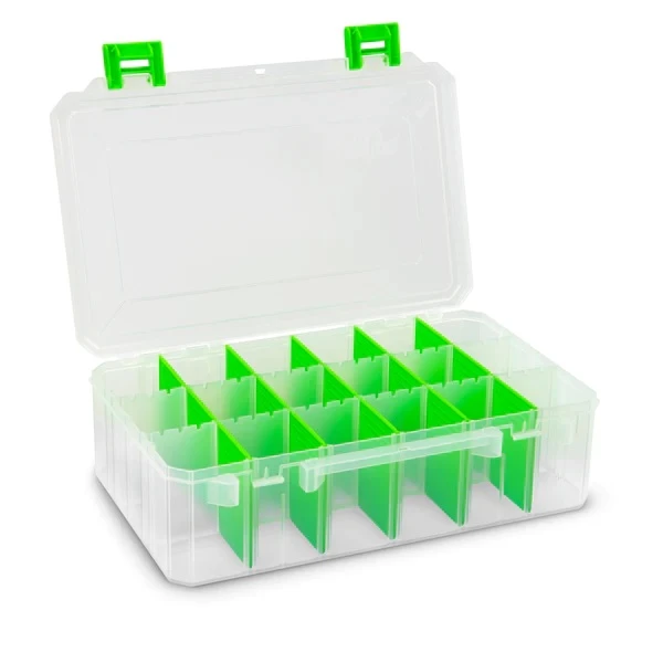 De Box Clear/Green is een hoogwaardige tacklebox van Lure Lock. Het is voorzien van doorzichtig plastic, stevige maar gemakkelijk te openen groene vergrendelingen en wordt geleverd met uit elkaar te klikken verdelers, zodat je je tacklebox kunt aanpassen zoals jij dat wilt. Ideaal voor vissers die hun aas in tackleboxen willen bewaren in plaats van in de originele verpakking.