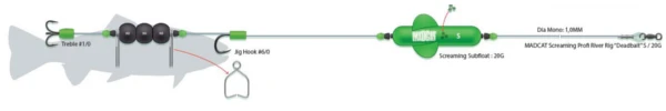 Deze kant-en-klare onderlijn is speciaal ontworpen voor het vissen met dood aas op meerval in een stromende rivier. De ‘screaming’ float zorgt in een stromende rivier voor veel extra attractie waarmee je zelfs de meest passieve vissen tot een aanbeet kunt verleiden. De 1mm dikke monolijn en de oersterke haken zorgen ervoor dat je zonder problemen de grootste vissen kunt landen!