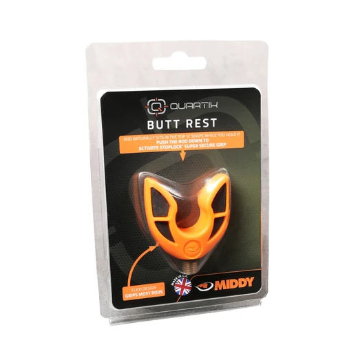 Dit is de butt rest uit het mooie Quartix feeder assortiment van Middy. Volledig op maat gemaakt met een compact ontwerp. Je hengel zal vanzelf op de bovenste V-vorm van het ontwerp liggen wanneer je je hengel in de hand houdt. Je kunt ook het handvat van de hengel in de steun drukken en zo zal hij superstrak vastgrijpen. Ideaal wanneer je net even een drankje wilt pakken of iets op je telefoon wilt doen. Deze achtersteun is geschikt voor verschillende maten hengeldiameters, dus bijna elke feederhengel is compatibel. Met een veilige messing schroefdraad en een zachte flexibele TPE rubberen structuur om de hengel te beschermen. Topproduct!