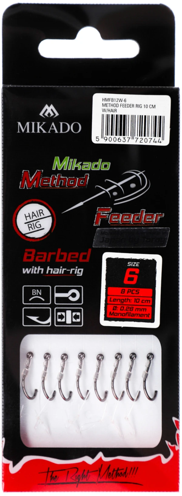 De Mikado Method Feeder Rig With Hair is een kant en klare method feeder onderlijn. De onderlijnen staan bekend als supersterk en de haken zijn zeer scherp. De verpakking beschikt over 8 stuks van 10 centimeter. De lijndikte is 0.20mm en de onderlijn is voorzien van een haakmaat 14 met weerhaak en een hair. Deze onderlijn zal de vis op de kant brengen!