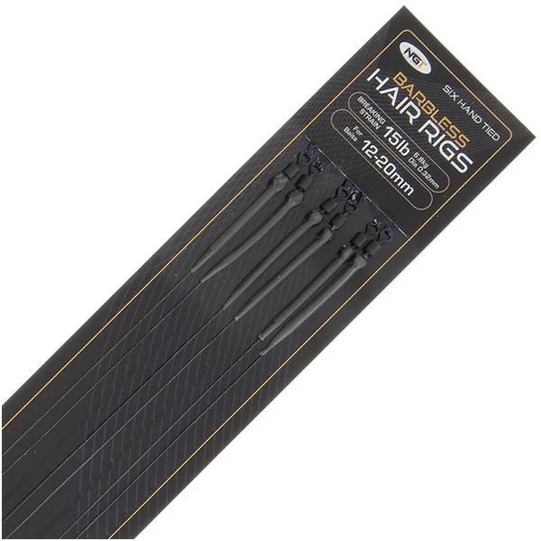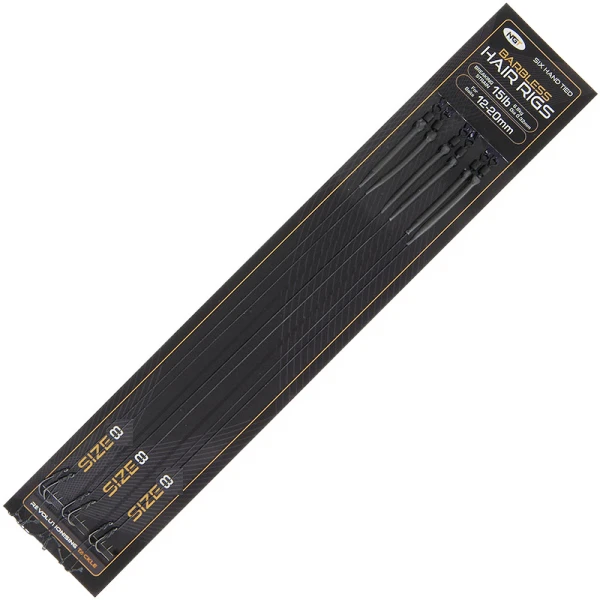 Deze NGT Sixpack Hair Rigs set bestaat uit zes weerhaakloze, handgebonden hairs in verschillende maten. Nu met verbeterde ‘slimline’ verpakking, betere haken, wartels en met krimpkous. Deze zijn geschikt voor 12-20 mm aas en hebben een trekkracht van bijna 7 kg.