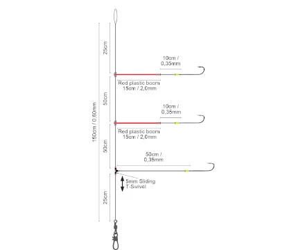 Deze paternosters van Spro zijn supermakkelijk in gebruik. Je bindt de lijn aan je hoofdlijn, prikt je aas op de vlijmscherpe haken en je kan vissen. De onderlijn is handgebonden uit stevig fluorocarbon, wat je lijn nagenoeg onzichtbaar maakt onder water. De fluorescerende kralen op de zijlijnen bieden je aas extra aantrekkelijk aan en trekken snel de aandacht van de vis. De rode plastic afhouders zorgen ervoor dat je aas niet in je lijn draait. Je kan deze onderlijnen gebruiken bij het vissen vanuit een boot of vanaf de kant. Ideaal voor de visserij op kleinere zoutwatervis.